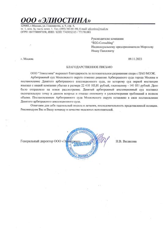 ООО “Элиостина” выражает благодарность за положительное разрешение спора c ПАО МОЭК.